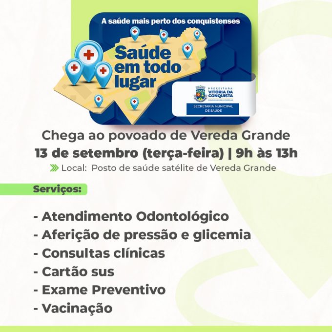 O Saúde em Todo Lugar é um projeto criado em 2021, com o compromisso de levar mais serviços de saúde à população que reside na zona rural de Vitória da Conquista. Vereda Grande é a 12ª localidade a receber a comitiva de saúde que já passou por Lagoa de José Luís, Bate-Pé, Limeira, Lagoa de Maria Clemência, Caiçara, Cabeceira, José Gonçalves, Assentamento Zumbi dos Palmares, Itapirema, Cercadinho e Queimadas.