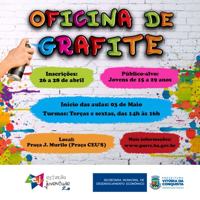 Estão abertas até quinta-feira (28), as inscrições para a oficina de grafite oferecida pela Secretaria Municipal de Desenvolvimento Econômico (SMDE), por meio da Coordenação da Juventude. São 20 vagas para jovens de 15 a 29 anos.
