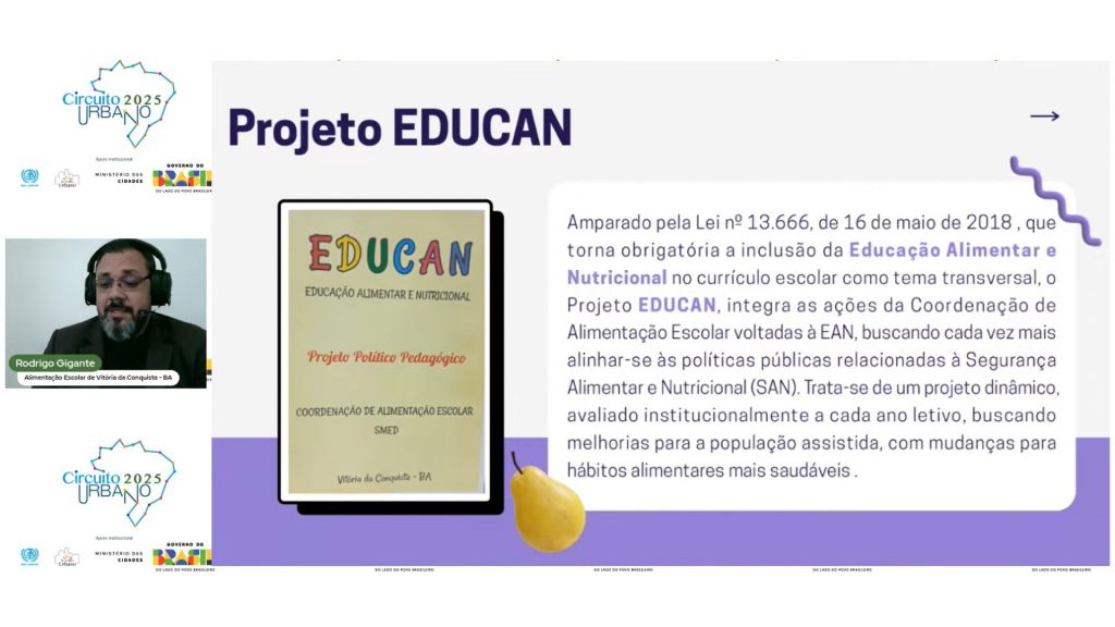 O coordenador de Alimentação Escolar da Smed, Rodrigo Gigante, apresentou o Projeto Educan que é desenvolvido nas escolas municipais. O projeto é amparado pela Lei 13.666/2018, que torna obrigatória a Educação Alimentar e Nutricional no currículo escolar. Começou a ser aplicado nas escolas, oficialmente, em 2022, para aproximadamente 5 mil alunos da Educação Infantil, e já chegou a 107 escolas e a 28 mil alunos da Educação Infantil e do Fundamental I.