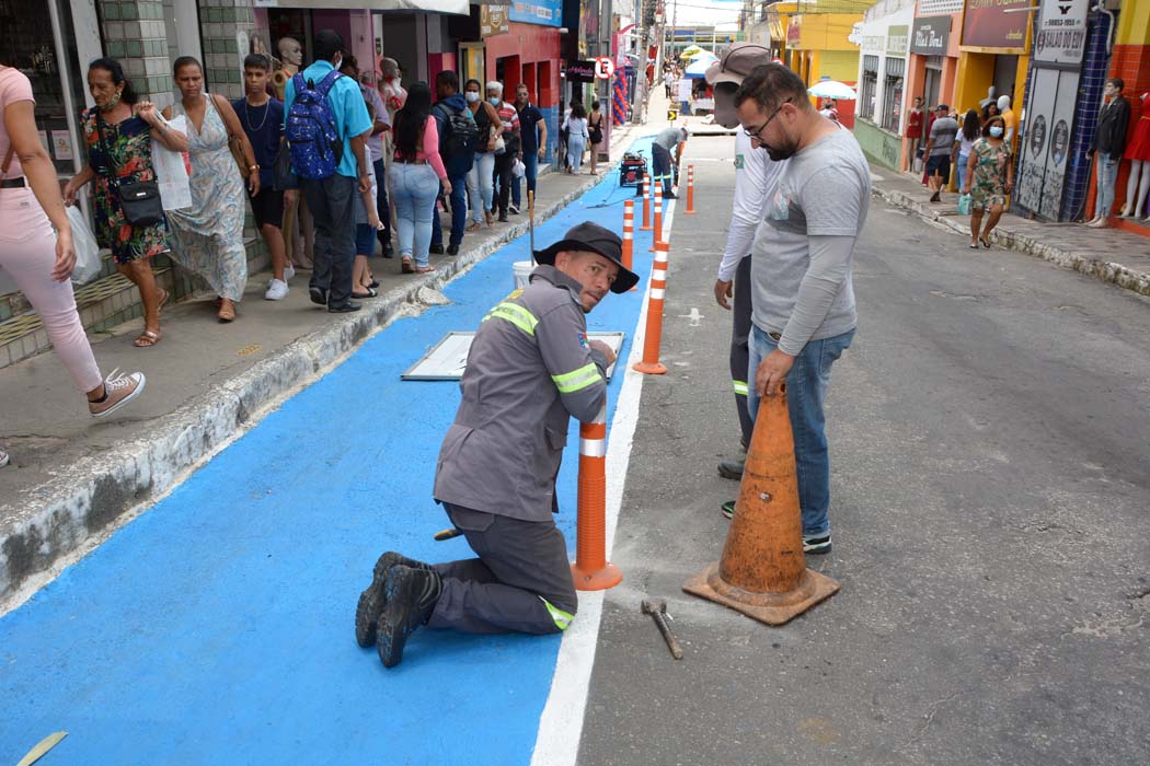 Para dar maior segurança para quem passa a pé pela Travessa Lauro de Freitas, no Centro, a Secretaria Municipal de Mobilidade Urbana (Semob) complementou a área de uso dos pedestres com sinalização horizontal e instalação de balizadores ao lado da calçada de um dos lados da via.