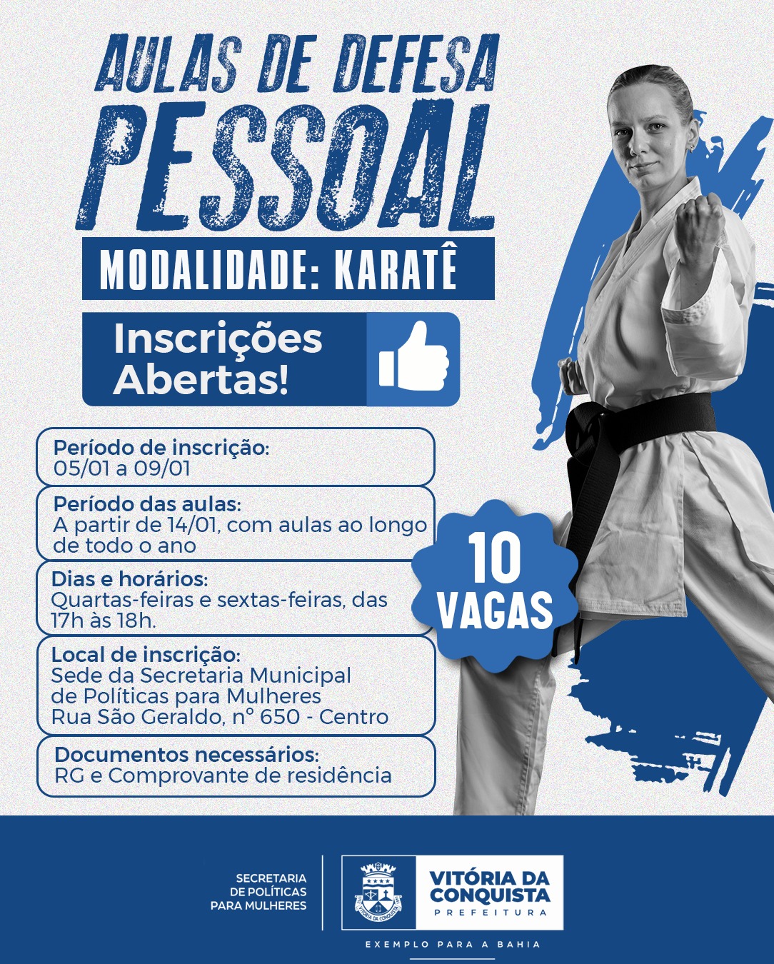 Com o objetivo de garantir às mulheres mais uma ferramenta de proteção física, empoderamento e autonomia, a Prefeitura de Vitória da Conquista, por meio da Secretaria Municipal de Políticas para Mulheres, em parceria com a Secretaria Municipal de Esportes, está com inscrições abertas para aulas de Defesa Pessoal, na modalidade karatê.