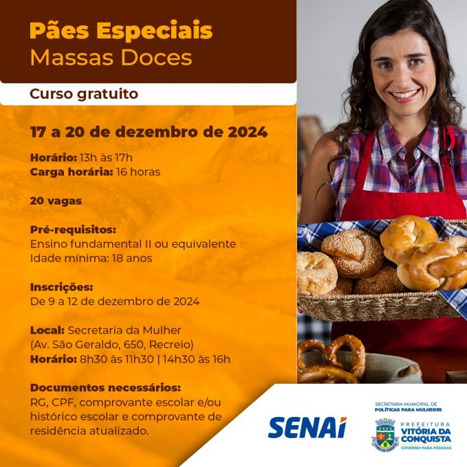 A partir desta segunda-feira (9), estarão abertas as inscrições para o curso gratuito Pães Especiais – Massas Doces, uma parceria da Secretaria Municipal de Políticas para Mulheres, por meio da Coordenação de Autonomia e Políticas Transversais, com o Serviço Nacional de Aprendizagem Industrial (Senai).