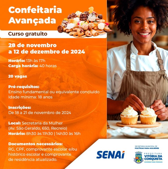 A partir desta segunda-feira (18), a Secretaria Municipal de Políticas para Mulheres, em parceria do Serviço Nacional de Aprendizagem Industrial (Senai), abrirá as inscrições para o curso de Confeitaria Avançada. Ao todo, serão 20 vagas.