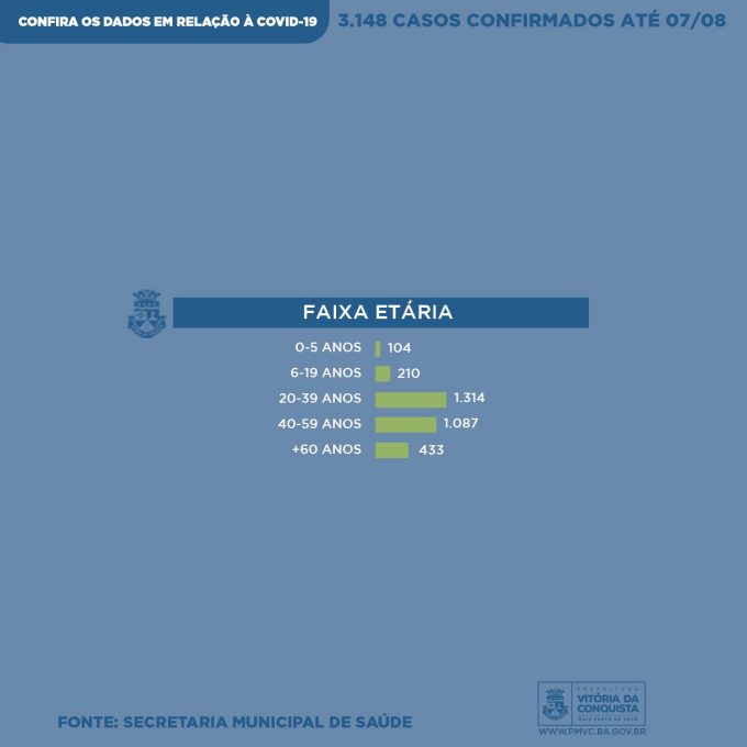 A Covid-19 acometeu 1.314 pacientes com idade entre 20 e 39 anos, 1.087 com idade entre 40 e 59 anos e outros 433 com mais de 60 anos. Além disso, foram registrados 210 casos de pacientes na faixa etária de 6 e 19 anos e mais 104 casos de crianças entre 0 e 5 anos.