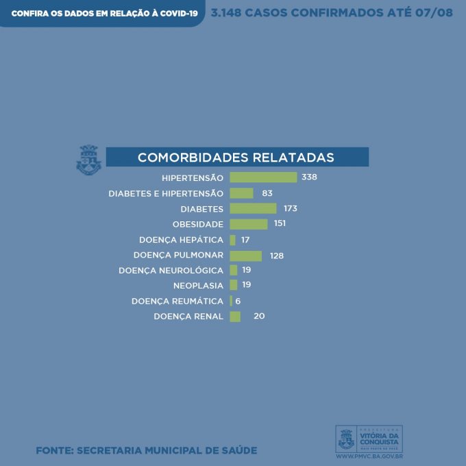 Os pacientes diagnosticados relataram possuir uma ou mais comorbidades – quando há duas ou mais doenças preexistentes – e fatores de risco para Covid-19: Hipertensão (338), Diabetes e Hipertensão (83), Diabetes (173), Obesidade (151), Doença Hepática (17), Doença Pulmonar (128), Doença Neurológica (19), Neoplasia (19), Doença Reumática (6) e Doença Renal (20).