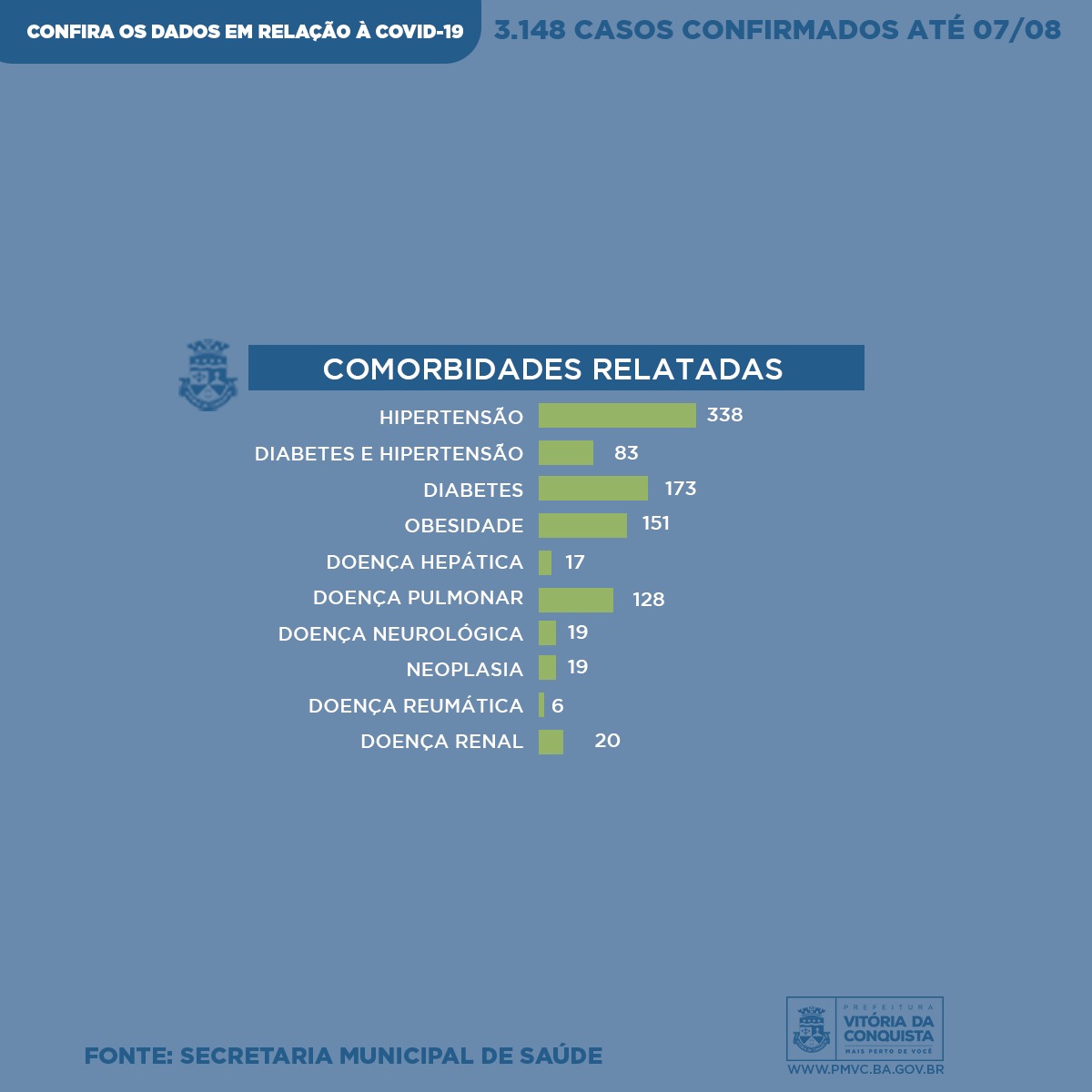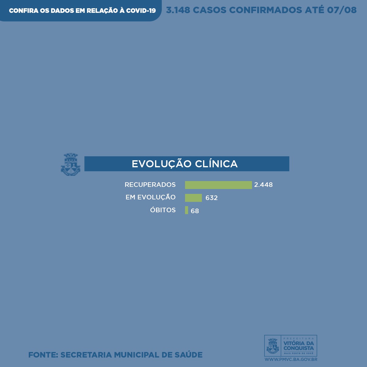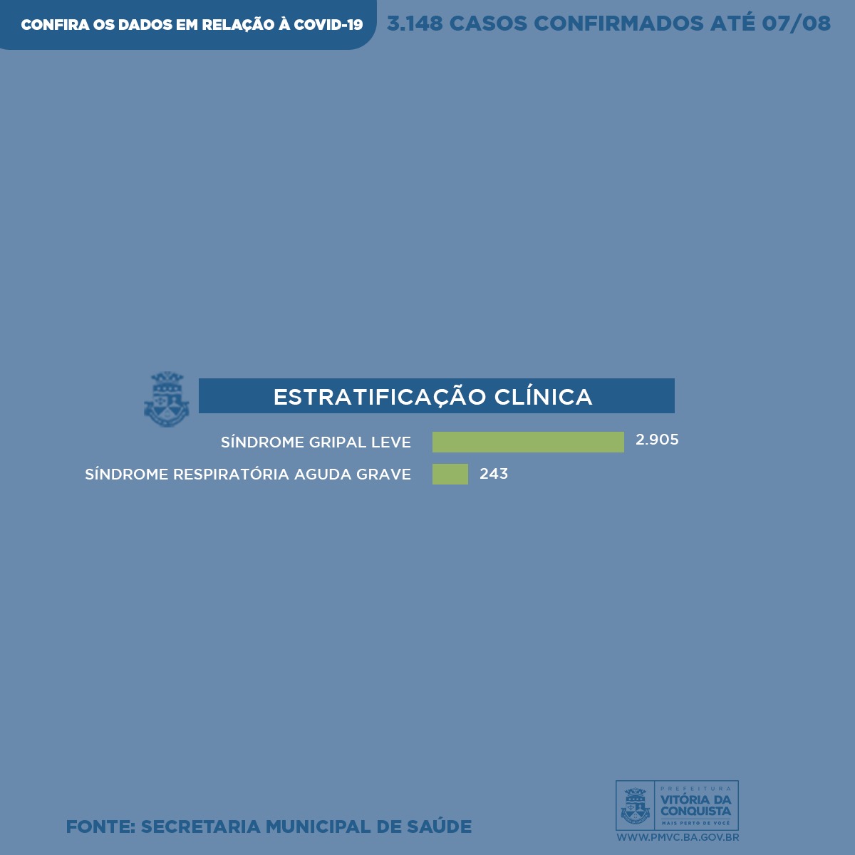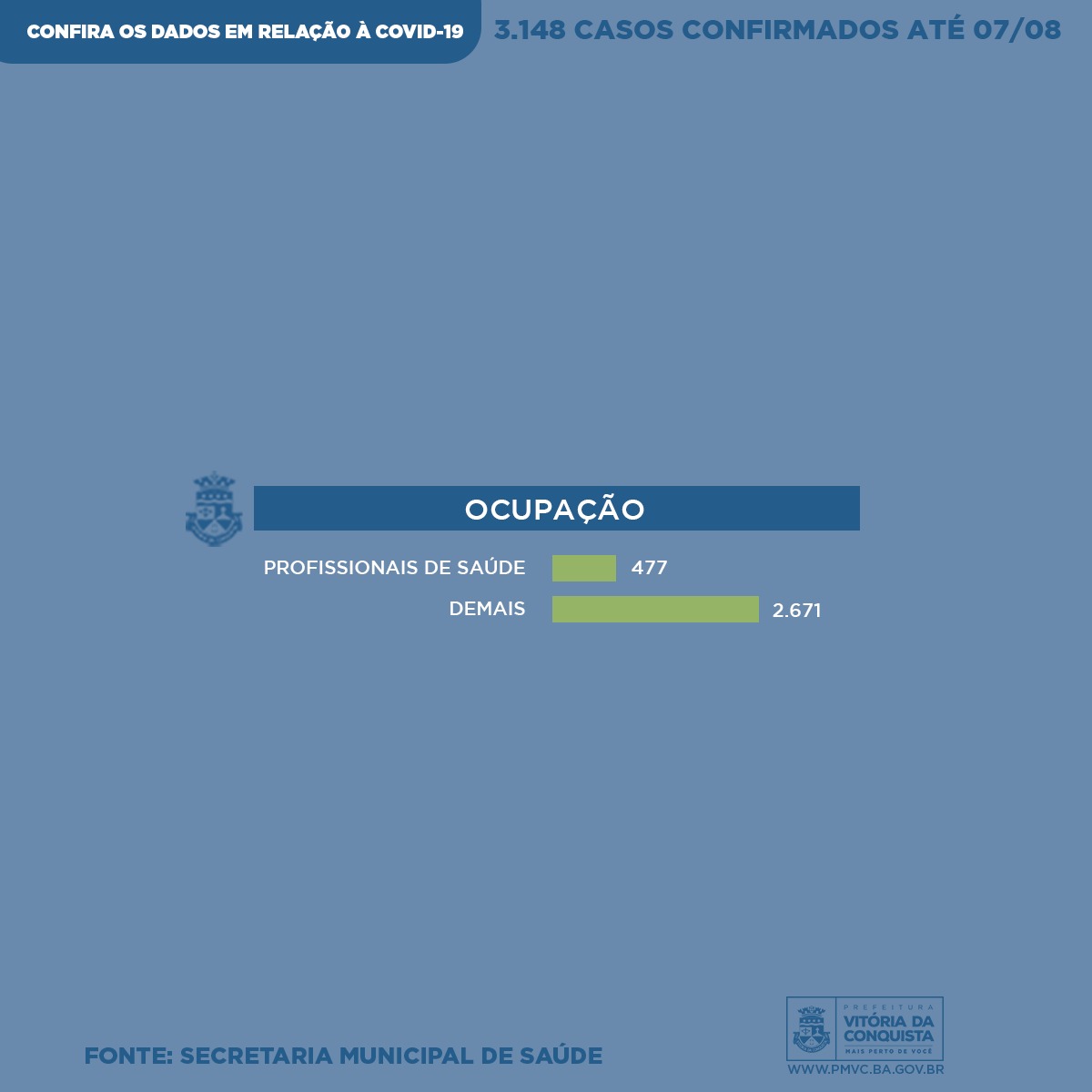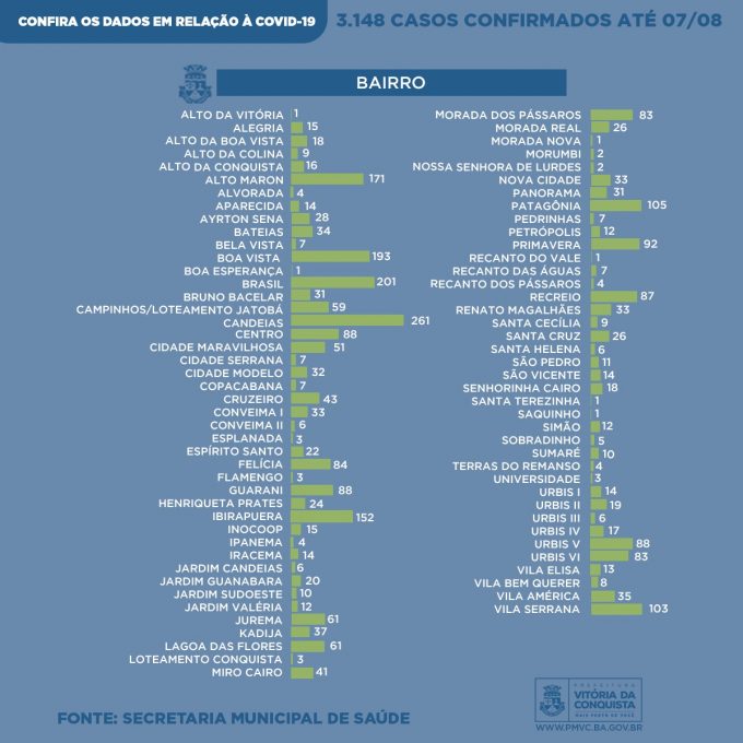 Neste sábado (8), a Vigilância Epidemiológica do município divulga o perfil semanal dos casos confirmados de Covid-19 em Conquista – desde o dia 27 de fevereiro, quando iniciaram as notificações, até a última sexta-feira (7) –, que registrou o total 3.148 casos. Os dados incluem o perfil de mais 633 pessoas que foram diagnosticadas com a doença ao longo dos últimos sete dias, bem como dos pacientes que vieram a óbito.