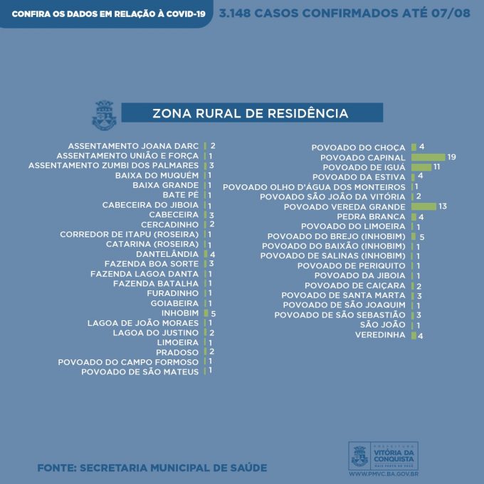 Enquanto que na zona rural do município foram diagnosticadas 124 pessoas, residentes do Assentamento Joana Darc (2), Assentamento União e Força (1), Assentamento Zumbi dos Palmares (3), Baixa do Muquem (1), Baixa Grande (1), Bate pé (1), Cabeceira (3), Corredor de Itaipu – Roseira (1), Catararina – Roseira (1), Cabeceira da Jiboia (1), Cercadinho (2), Dantelândia (4), Fazenda Boa sorte (3), Fazenda Lagoa Danta (1), Fazenda Batalha (1), Furadinho (1), Goiabeira (1), Inhobim (5), Lagoa de João Moraes (1), Lagoa do Justino (2), Limoeira (1), Pradoso (4), Pedra Branca/Assentamento Casulo (4), Povoado do Brejo – Inhobim (5), Povoado do Baixão – Inhobim (1), Povoado Salinas – Inhobim (1), Povoado Capinal (19), Povoado do Choça (4), Povoado da Estiva (4), Povoado de Iguá (11), Povoado Olho d’agua dos Monteiros (1), Povoado de Periquito (1), Povoado São João da Vitória (2), Povoado Vereda Grande (13), Povoado da Jiboia (1), Povoado Campo Formoso (1), Povoado São Mateus (1), Povoado Caiçara (2), Povoado de Santa Marta (3), Povoado de São Joaquim (1), Povoado de São Sebastião (3), São João (1) e Veredinha (4).