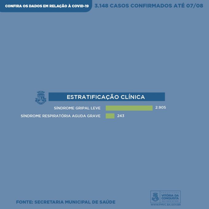 Quanto à manifestação dos sintomas, 2.905 pacientes apresentaram sintomas leves de Síndrome Gripal e 243 apresentaram Síndrome Respiratória Aguda Grave (SRAG), necessitando ser internados para tratamento em unidade hospitalar. Destes pacientes, 2.448 já estão recuperados e 632 ainda apresentam sintomas, com possibilidade de transmissão, e seguem em recuperação – 38 internados e 594 em tratamento domiciliar.