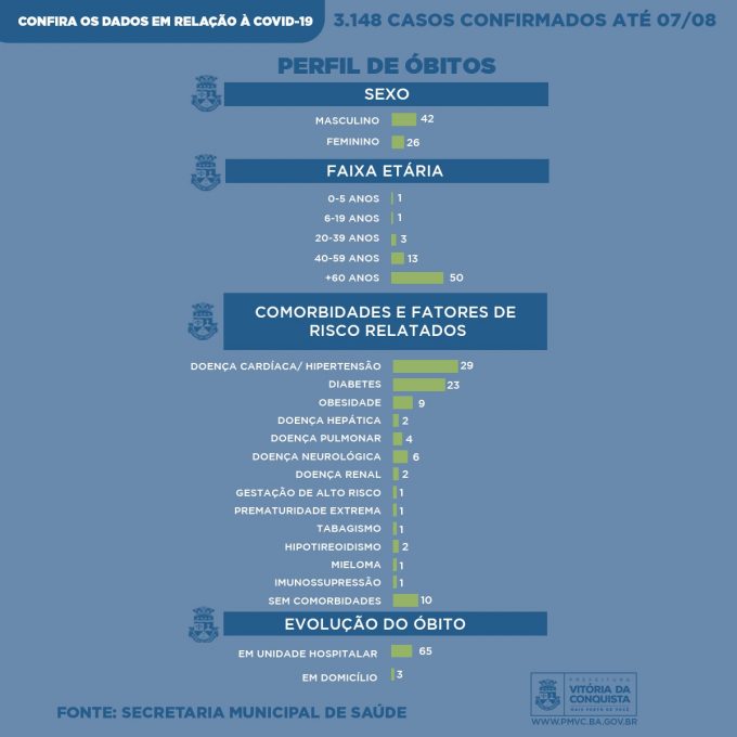 Até o momento, 68 pacientes do município foram a óbito por complicações da Covid-19, sendo que 65 deles faleceram em unidade hospitalar e três em domicílio. Faleceram 42 pessoas do sexo masculino e 26 do sexo feminino – 50 delas possuíam mais de 60 anos, 13 tinham idade entre 40 e 59 anos, três entre 20 e 39 anos, um com idade entre 6 e 19 anos e um recém-nascido prematuro.