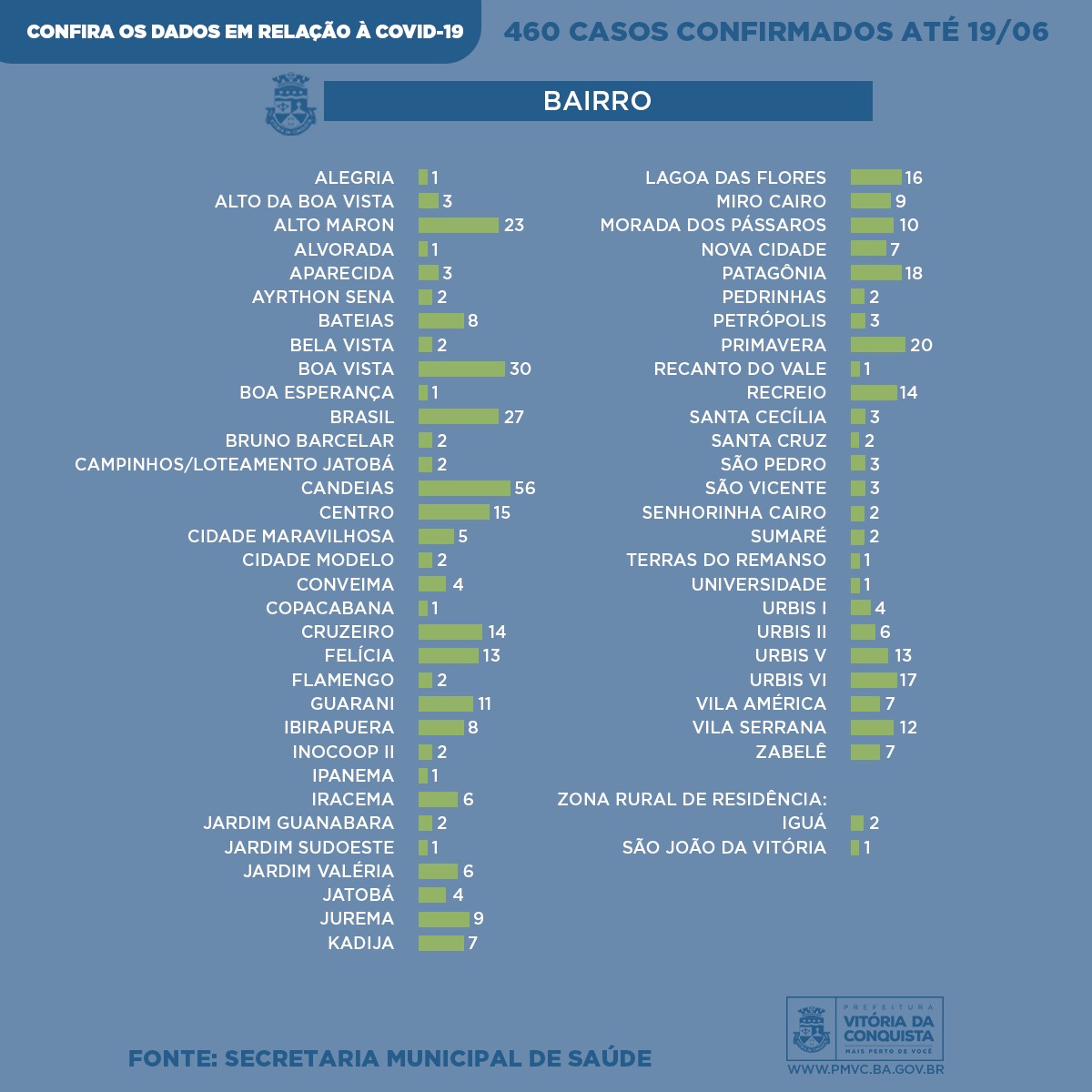 As outras 457 pessoas que foram infectadas pela Covid-19 são residentes das seguintes localidades da zona urbana: Alegria (1), Alto da Boa Vista (3), Alto Maron (23), Aparecida (3), Ayrton Sena (2), Bateias (8), Bela Vista (2), Boa vista (30), Boa Esperança (1), Brasil (27), Bruno Barcelar (1), Campinhos/Loteamento Jatobá (2), Candeias (56), Centro (15), Cidade maravilhosa (5), Cidade Modelo (2), Conveima (4), Copacabana (1), Cruzeiro (14), Felícia (13), Flamengo (2), Guarani (11), Ibirapuera (8), Inocoop II (2), Ipanema (1), Iracema (6), Jardim Guanabara (2), Jardim Sudoeste (1), Jardim Valéria (6), Jatobá (4), Jurema (9), Kadija (7), Lagoa das Flores (16), Miro Cairo (9), Morada dos Pássaros (10), Nova Cidade (7), Patagônia (18), Pedrinhas (2), Petrópolis (3), Primavera (20), Recanto do Vale (1), Recreio (14), Santa Cecília (3), Santa Cruz (2), São Pedro (3), São Vicente (3), Senhorinha Cairo (2), Sumaré (2), Terras do Remanso (1), Universidade (1), Urbis I (4), Urbis II (6), Urbis V (13), Urbis VI (17), Vila América (7), Vila Serrana (12) e Zabelê (7).