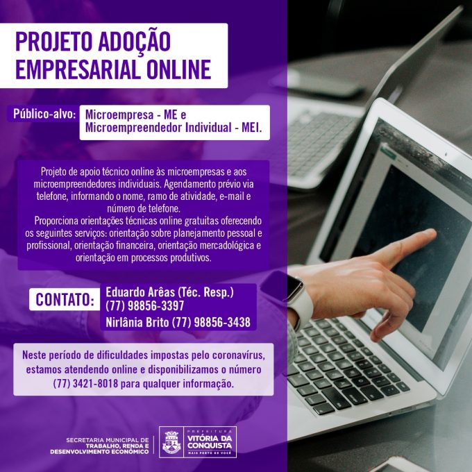 Com o objetivo de promover alternativas para melhoria e sustentabilidade dos negócios das microempresas e microempreendedores individuais de Vitória da Conquista durante a pandemia da Covid-19, a Secretaria Municipal de Trabalho, Renda e Desenvolvimento Econômico (Semtre) desenvolveu o projeto de Adoção Empresarial Online.