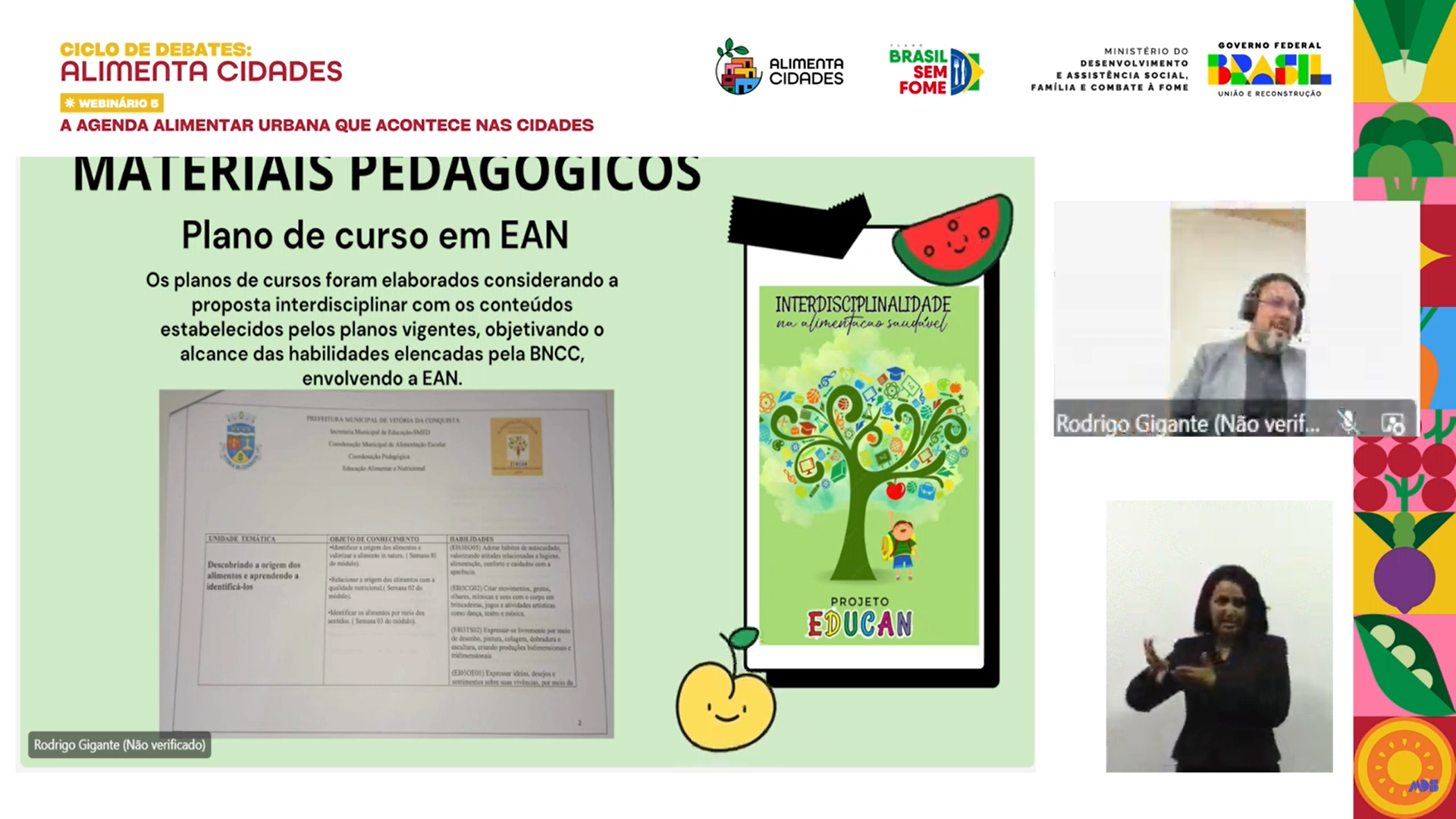 Segundo Rodrigo Gigante, o município foi selecionado para apresentar o Projeto Educan. “É Vitória da Conquista sendo exemplo para a Bahia e para o Brasil”. Em sua apresentação, ele mostrou os materiais pedagógicos e o plano de curso em Educação Alimentar Nutricional (EAN), elaborado a partir da proposta interdisciplinar e descreveu os princípios norteadores para as ações com as práticas pedagógicas, a interdisciplinaridade.