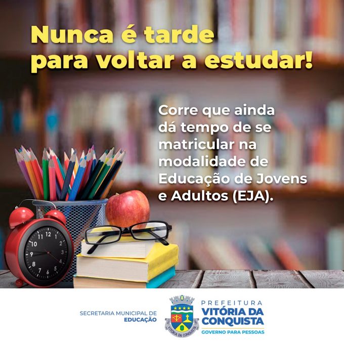 A Secretaria Municipal de Educação (SMED) informa que as matrículas para a Educação de Jovens e Adultos (EJA) continuam abertas. Quem tem 15 anos ou mais e não concluiu o ensino fundamental, ainda dá tempo de se inscrever.