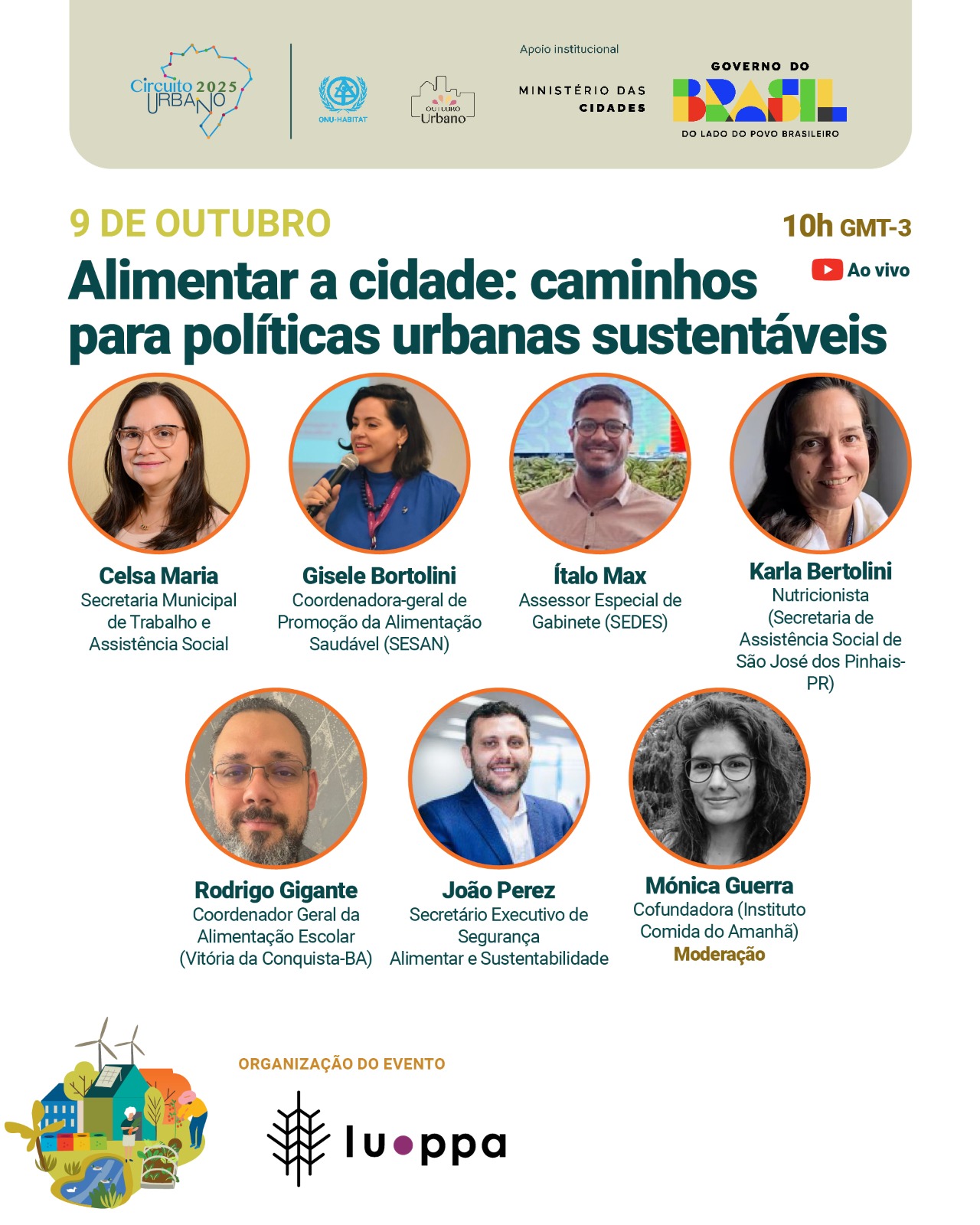 A programação faz parte do Circuito Urbano 2025 – ONU-Habitat e propõe um diálogo entre governos locais sobre como fortalecer políticas alimentares urbanas sustentáveis, alinhadas aos Objetivos de Desenvolvimento Sustentável (ODS), à Nova Agenda Urbana e à COP30. Seis municípios participantes do LUPPA e do Alimenta Cidades vão apresentar experiências concretas de segurança alimentar, sustentabilidade e governança local.