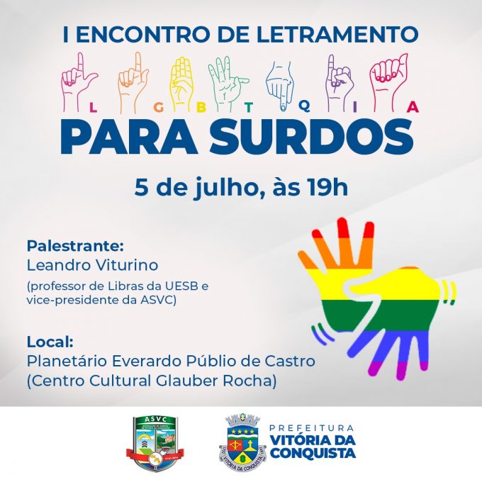 Diante da ampliação das tecnologias e de novas letras associadas ao público LGBTQIAPN+, a Secretaria Municipal de Educação (Smed), por meio da Central de Interpretação de Libras (CIL), em parceria com a Associação dos Surdos de Vitória da Conquista (ASVC), promove o 1º Encontro de Letramento LGBTQIAPN+ para Surdos, com o professor da Universidade Estadual do Sudoeste da Bahia (Uesb), Leandro Viturino. O evento acontecerá na próxima sexta-feira (5), às 19h, no foyer do Planetário Everardo Públio de Castro.