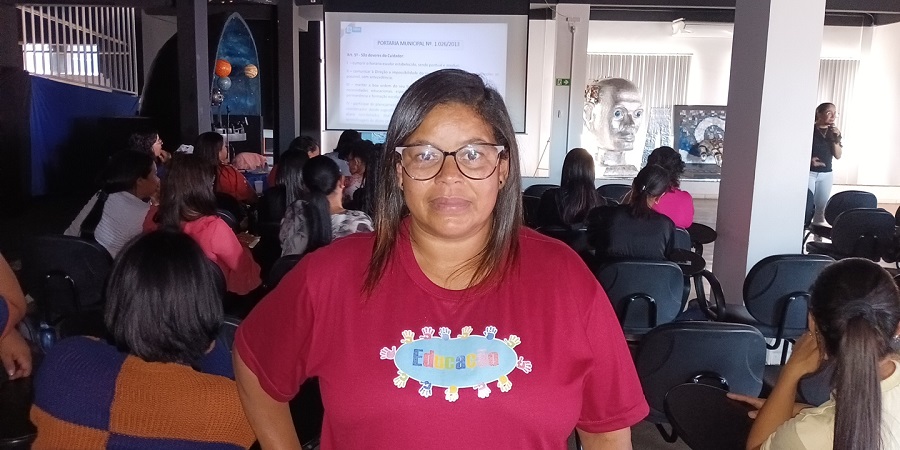 Auxiliar de Vida Escolar na Escola Municipal Batista Tia Zefa, Agmaí de Jesus Souza atua há dois anos como auxiliar e considerou a formação como muito importante. “Tenho aprendido muito, descobrindo como tratar e cuidar das crianças com deficiência e melhorado meu comportamento como pessoa. Na formação eu complemento esse convívio com a criança lá na escola”.