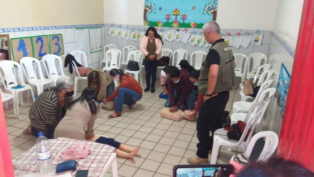 A Secretaria Municipal de Educação (Smed) promoveu um treinamento de primeiros socorros na Creche Escola Lar da Criança Meimei, que mantém convênio com a Prefeitura. A atividade ocorreu durante toda esta terça-feira (5) com a participação da diretoria, funcionários e mães parceiras. O curso preparou para prestar um socorro rápido e correto, inclusive para facilitar no chamado do Samu 192. O treinamento teve o auxílio dos instrutores Mário e Sinron do serviço de emergência.