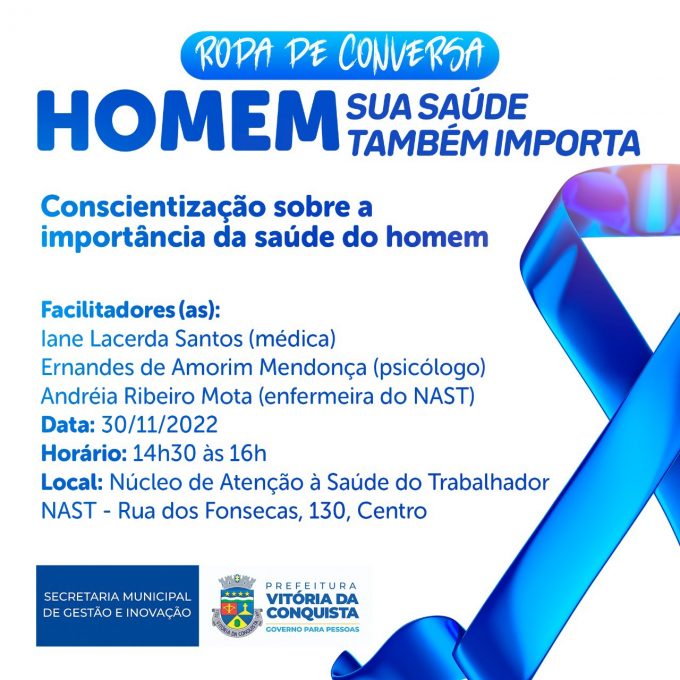 A Secretaria Municipal de Gestão e Inovação (Semgi), por meio do Núcleo de Atenção à Saúde do Trabalhador (Nast), promoverá uma roda de conversa com o tema “Homem: sua saúde também importa”.