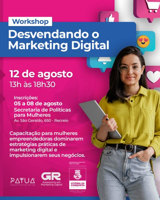 A Secretaria Municipal de Políticas para Mulheres (SMPM), por meio da Coordenação de Autonomia e Políticas Transversais para Mulheres, abriu as inscrições para o workshop Desvendando o Marketing Digital, que será realizado na próxima terça-feira (12).
