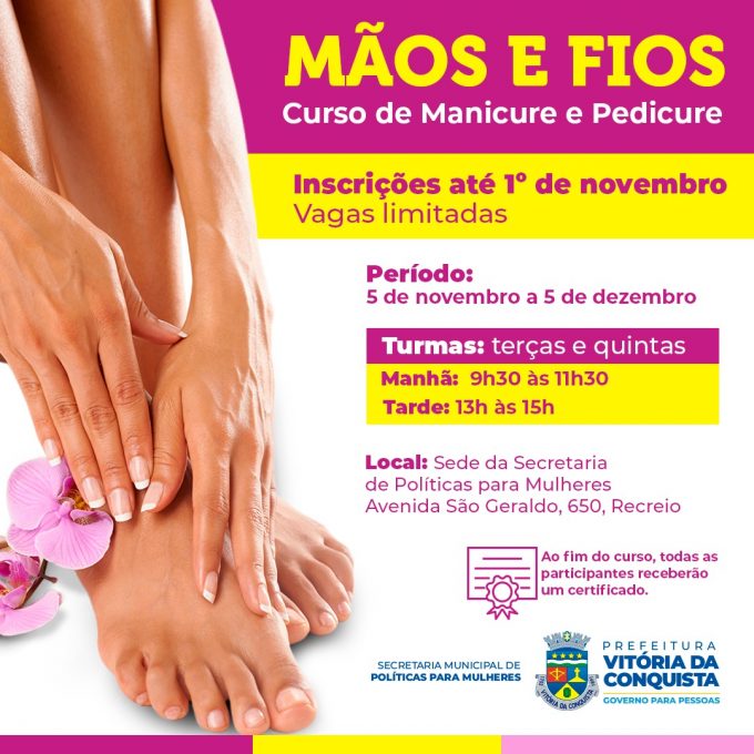 Estão abertas as inscrições para o curso “Mãos e Fios”, de Manicure e Pedicure, promovido pela Secretaria Municipal de Políticas para Mulheres.