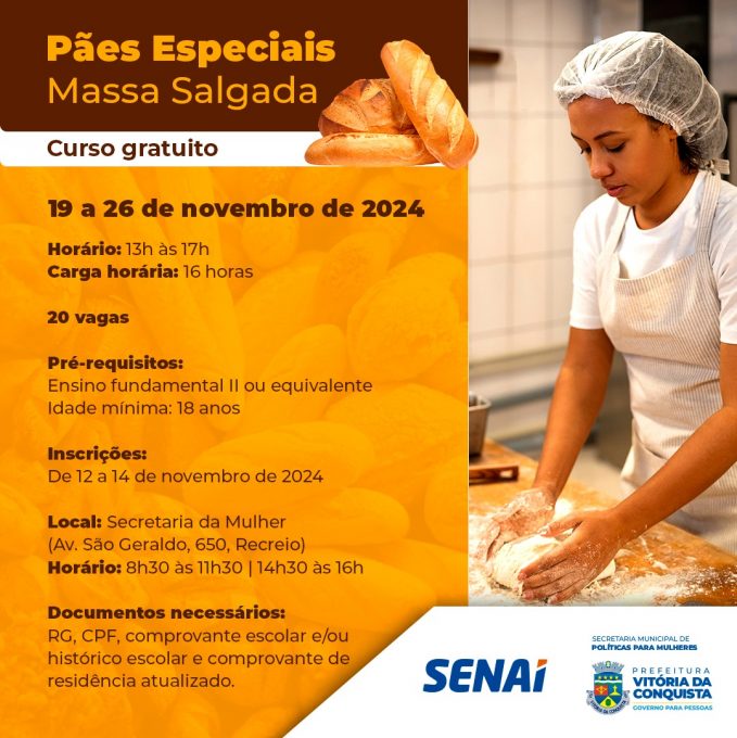 A partir desta terça-feira (12), a Secretaria Municipal de Políticas para Mulheres (SMPM), por meio da coordenação de Autonomia e Políticas Transversais, em parceria com o Serviço Nacional de Aprendizagem Industrial (Senai), está com inscrições abertas para o curso de pães especiais com massa salgada.