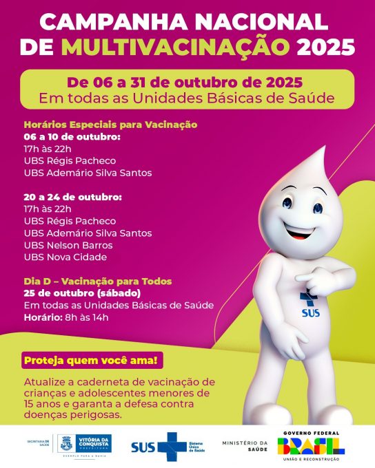 Como etapa inicial da campanha de multivacinação, a intensificação no município terá início no dia 6, com as Unidades de Saúde Régis Pacheco e Admário Silva Santos abertas em horário estendido, das 17h às 22h, facilitando o acesso para aqueles que não conseguem comparecer no horário habitual.