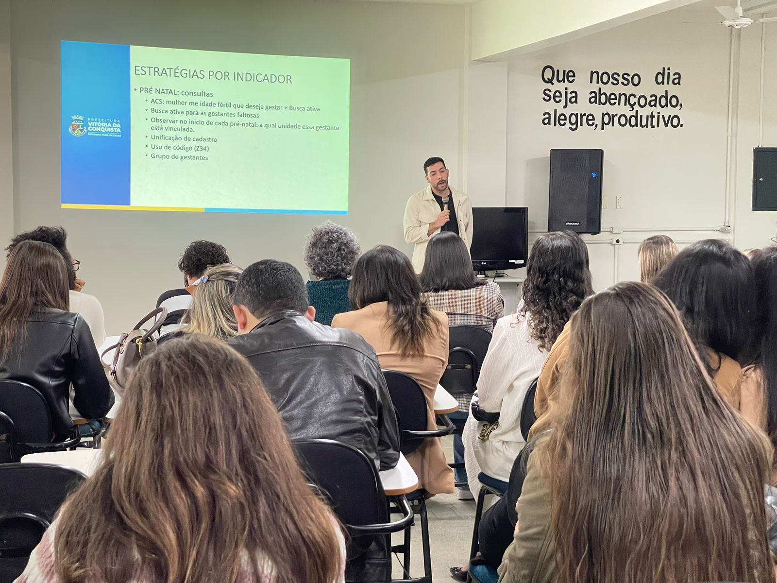 Ao longo do dia, foram abordados diversos temas acerca da Atenção Primária à Saúde (APS), que envolvem as diretrizes de saúde do Governo Municipal; indicadores do Previne Brasil e a qualidade do acesso às consultas e procedimentos médicos na APS; estratégias e tecnologias em saúde disponíveis na APS para acompanhamento efetivo de pacientes com doenças crônicas; acolhimento e encaminhamento de demandas da Saúde Mental e Diabetes; a importância da abordagem das Síndromes gripais na APS, para evitar demanda desnecessária nos serviços de urgência e emergência; Protocolo Municipal de Oxigenoterapia; e os fluxos para encaminhamento correto de demandas à Policlínica Regional.