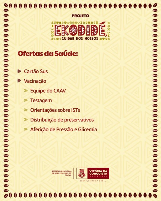 O projeto é desenvolvido pela Semdes, por meio da Coordenação de Promoção da Igualdade Racial, em articulação com a Secretaria Municipal de Saúde (SMS). Durante a ação desta sexta-feira, serão ofertados os seguintes serviços: