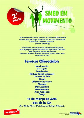 O “Smed em Movimento“ é direcionado aos professores da rede municipal de ensino e acontece mensalmente. Durante o evento, também será realizada aferição de pressão, de glicose, de peso e altura, além da oferta de serviços de cabeleireiro, massagista e nutricionista. Haverá ainda apresentação de grupos de capoeira, dança e orientações gerais sobre a prática de exercícios físicos.