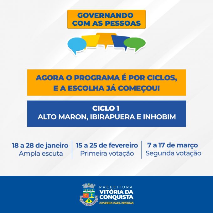 A partir de amanhã (15), os moradores do Alto Maron, Ibirapuera e Inhobim estarão escolhendo cinco intervenções que desejam receber no bairro onde reside. A votação faz parte do Governando com as Pessoas – programa da Prefeitura de Vitória da Conquista, em que cada cidadão pode indicar e votar, por ordem de prioridade, os investimentos que o governo municipal deve realizar.