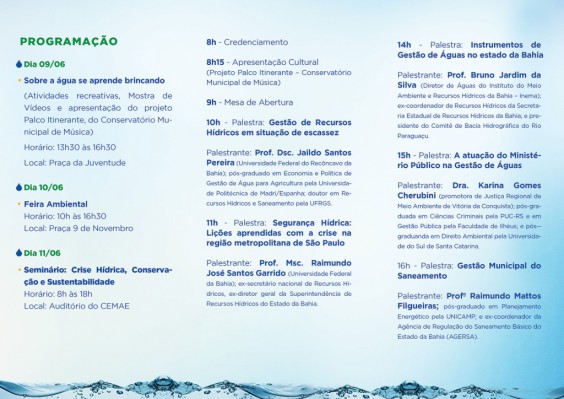 A única atividade que requer inscrição é o seminário que acontece no dia 11 e reúne estudiosos da área. Com o tema “Crise Hídrica, Conservação e Sustentabilidade”, a Semana do Meio Ambiente busca debater, com a comunidade, a importância dos recursos hídricos, incentivando o consumo consciente e terá início com uma Blitz Ambiental, no dia 9, nos semáforos das avenidas Juracy Magalhães, Brumado e Siqueira Campos.