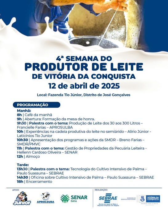 Voltado para pecuaristas, profissionais da área, estudantes e acadêmicos, a 4ª edição da Semana do Produtor de Leite de Vitória da Conquista, promovida pela Prefeitura Municipal, será realizada no dia 12 de abril, na Fazenda Tio Júnior, distrito de José Gonçalves, e contará com palestras e oficinas voltadas à bovinocultura de leite. O objetivo do evento é discutir toda a cadeia produtiva, identificando as potencialidades, os gargalos e as intervenções necessárias para fomentar a produção de leite e seus derivados, com reflexos na geração de emprego e renda.