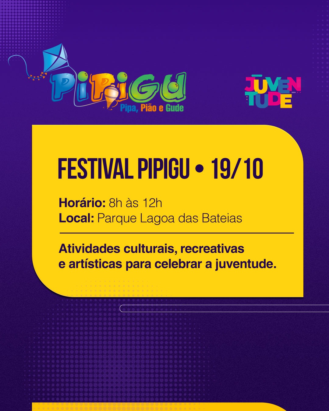 19/10 – Festival Pipa, Pião e Gude (Pipigu), das 8h às 12h, no Parque Lagoa das Bateias