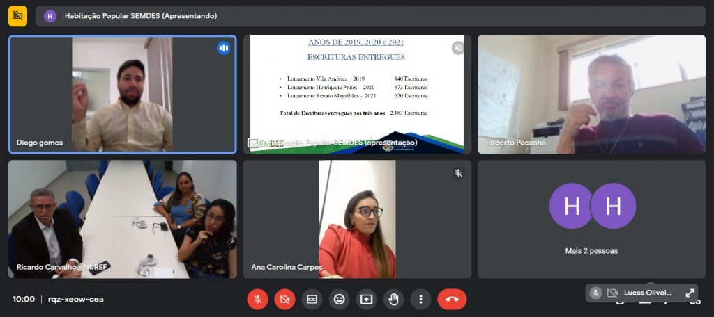 A Secretaria de Desenvolvimento Social (Semdes), por meio da Diretoria de Habitação de Interesse Social, teve uma reunião on-line com representantes da Prefeitura de Salvador e do Núcleo de Regularização Fundiária (Nuref), do Tribunal de Justiça do Estado da Bahia para apresentar a experiência de regularização fundiária que vem sendo executada em Vitória da Conquista.