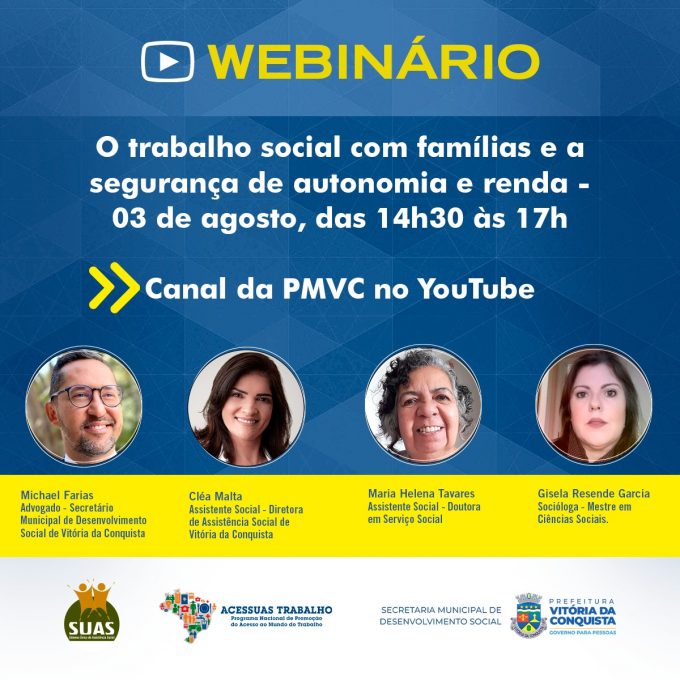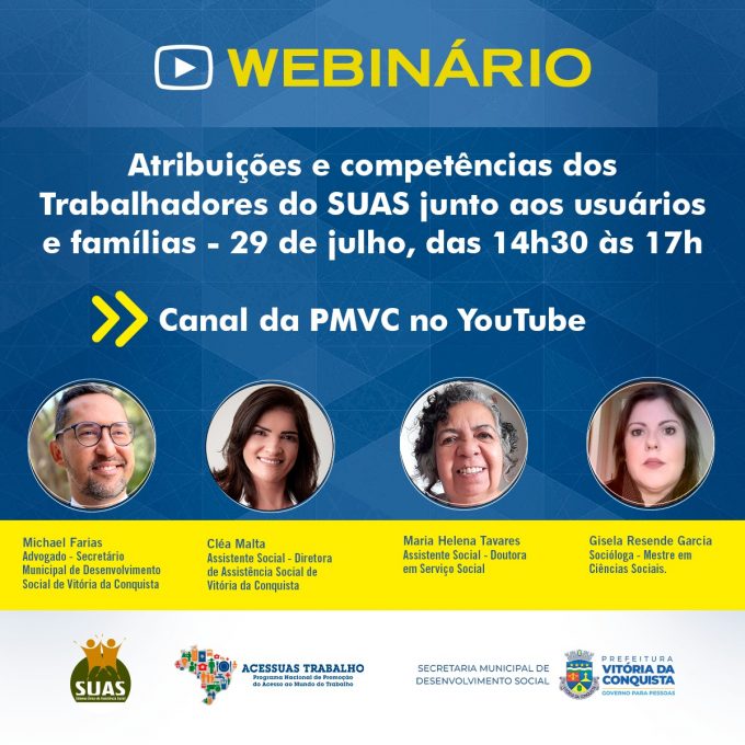 Em 29 de julho, será o momento de debater “Atribuições e competências dos Trabalhadores do SUAS junto aos usuários e famílias”. Logo mais, no dia 3 de agosto, o evento falará sobre “O trabalho social com famílias e a segurança de autonomia e renda”. Os webinários serão transmitidos no canal oficial da Prefeitura no YouTube, sempre das 14h30 às 17h.