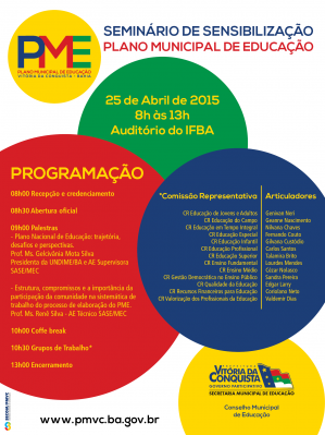 Acontece nesse sábado, 25, o Seminário de Sensibilização do Plano Municipal de Educação (PME) promovido pela Prefeitura de Vitória da Conquista, por meio da Secretaria Municipal de Educação, em parceria com o Conselho Municipal de Educação. O evento será realizado das 8h às 13h, no auditório do Instituto Federal de Educação, Ciência e Tecnologia da Bahia (Ifba).