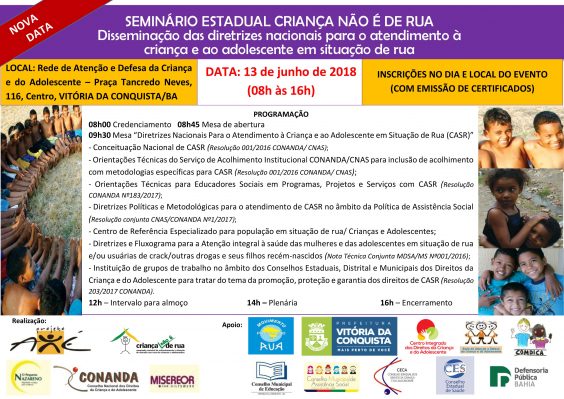 Nos próximo dia 13 de junho, quarta-feira, o Projeto Axé*, com o apoio da Prefeitura Municipal, realiza o Seminário Estadual Criança Não é de Rua em Vitória da Conquista. O evento acontece a partir das 8h, no auditório da Rede de Atenção e Defesa da Criança e do Adolescente, centro da cidade.