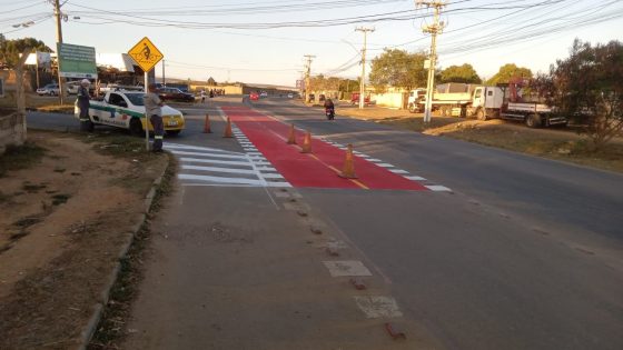 A Secretaria Municipal de Mobilidade Urbana, por meio da Coordenação de Trânsito, está revitalizando as ciclovias e ciclofaixas do município. O trabalho conta com pintura e implantação de cruzamentos rodocicloviários, sinalizados por linhas tracejadas e faixas vermelhas.