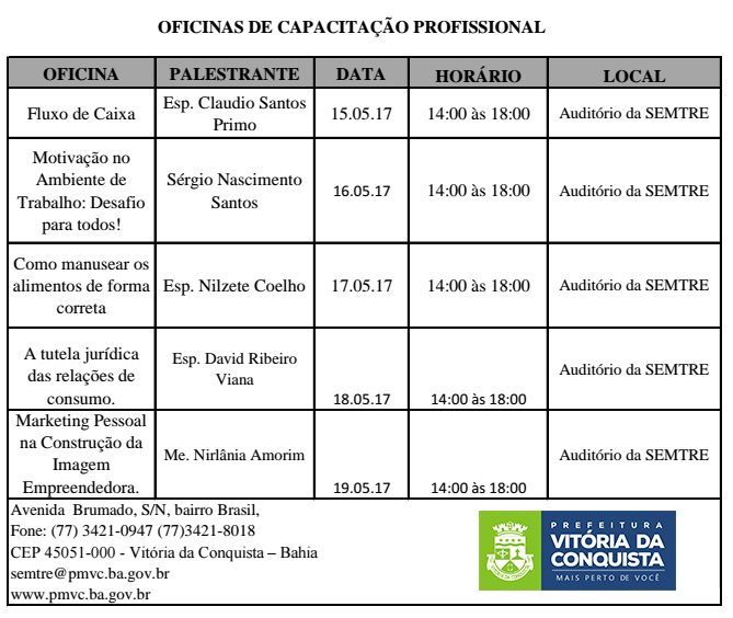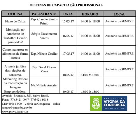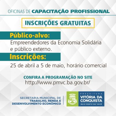 De 15 a 19 de maio, a Secretaria Municipal de Trabalho, Renda e Desenvolvimento Econômico irá realizar um ciclo de Oficinas de Capacitação Profissional destinado aos Empreendedores da Economia Solidária e ao público em geral.