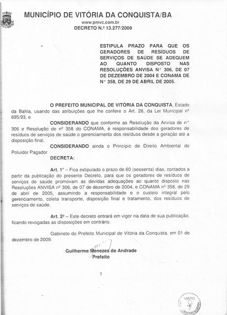 Para cumprir esse decreto, a partir de 2010, os resíduos dos serviços de saúde, denominados popularmente como lixo hospitalar, produzidos pelos serviços municipais de saúde passaram a ser coletados, tratados, transportados e descartados por uma empresa especializada. Com essas medidas, Vitória da Conquista passou a cumprir rigorosamente as normas nacionais estabelecidas pela Agência Nacional de Vigilância Sanitária (Anvisa), por meio da Resolução nº 306/2004, e pelo Conselho Nacional de Meio Ambiente (Conama), por meio da Resolução nº 358/2005, quanto ao manejo desses resíduos.