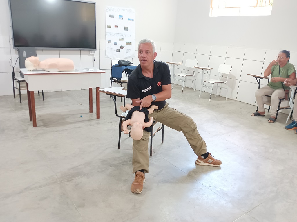 “A diabetes, por exemplo, é descoberta na infância e na adolescência. No dia a dia das escolas, o profissional pode identificar algumas situações e suspeitar que o aluno está desencadeando a doença. Aquela criança que pede muito para ir ao banheiro, que pede água a todo momento, que chegou de manhã cedo e está hipoativa, que só vai ficar ativa após a primeira alimentação, são alguns exemplos, sinais de que ela pode estar desenvolvendo o diabetes”, explicou Lucimário. Na prática, o instrutor ensinou como agir em situações de engasgo.