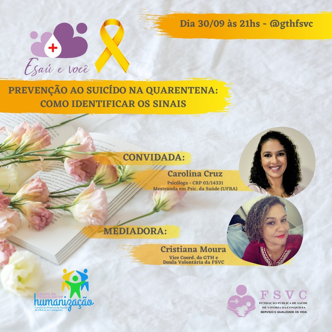 A Fundação de Saúde de Vitória da Conquista realiza nesta quarta-feira (30), às 21h, mais uma live dentro da campanha do Setembro Amarelo. “Prevenção ao suicídio na quarentena: como identificar os sinais” será o tema abordado pela psicóloga Carolina Alves Cruz – mestranda em Psicologia da Saúde (UFBA) e especialista em Urgência e em Gestalt-terapia. O bate-papo será mediado por Cristiana Moura, vice coordenadora do Grupo de Trabalho de Humanização (GTH) e doula voluntária, e transmitido pelo instagram @gthfsvc.