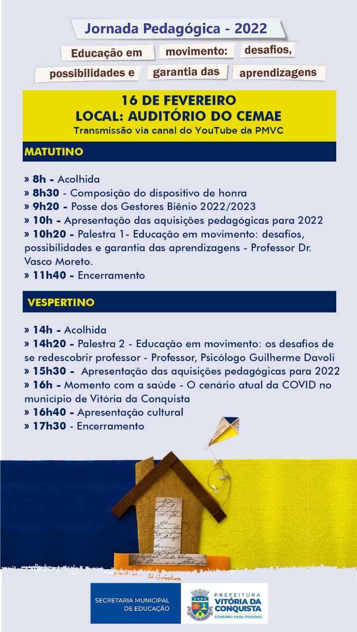 A partir das 8h desta quarta-feira (16) os profissionais do magistério público municipal participam da Jornada Pedagógica 2022, que este ano tem como tem “Educação em movimento: desafios, possibilidades e garantia das aprendizagens”.