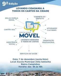 Na próxima sexta-feira (07), o Governo Municipal levará aos bairros Simão e Campinhos uma série de serviços e ações. É a nona edição do Prefeitura Móvel, que funcionará das 9h às 16h, na Escola Municipal Zélia Saldanha, situada na Rua Santa Catarina, no bairro Simão.