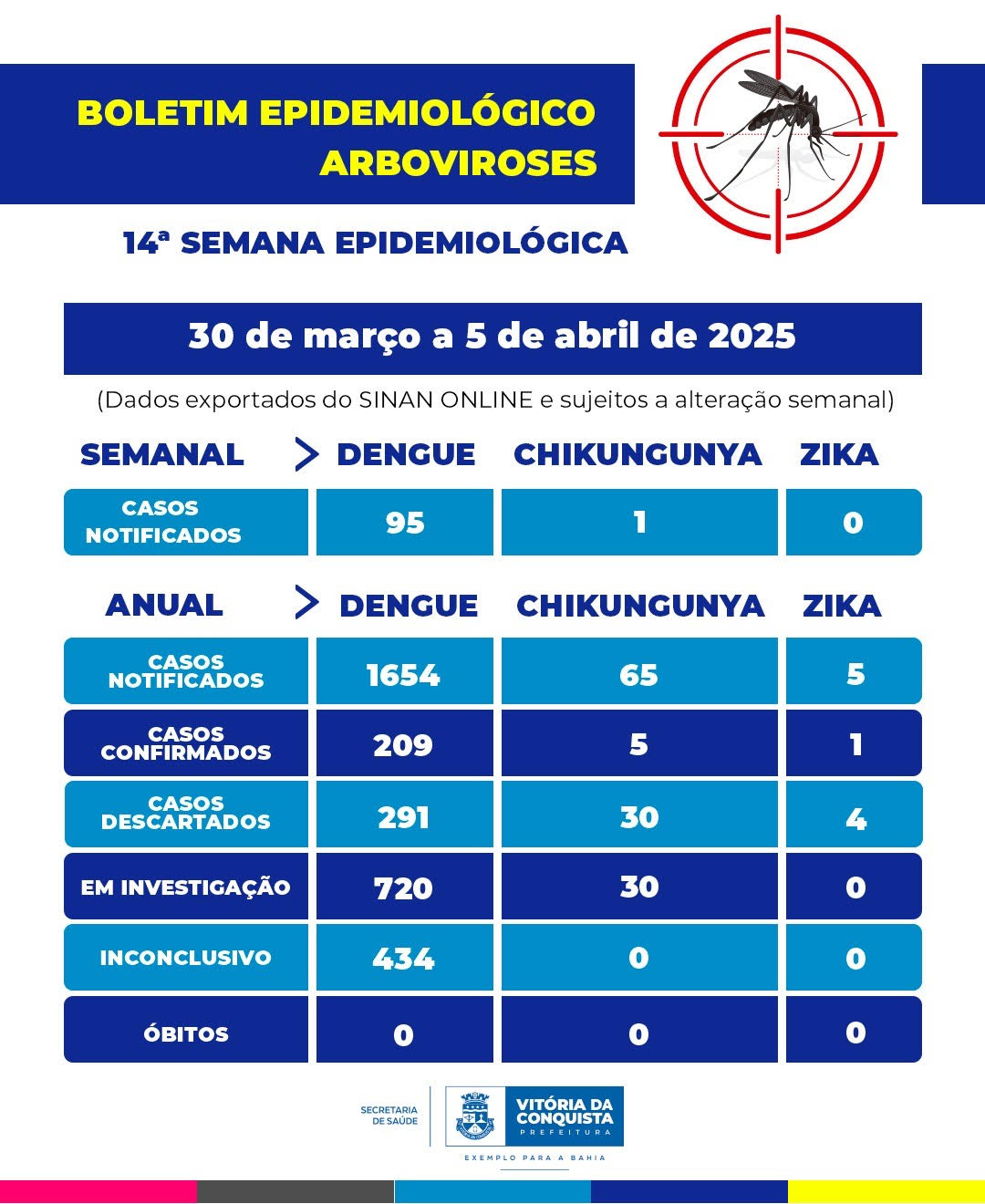 Segundo o Sistema Nacional de Notificação (Sinan), de 30 de março a 5 de abril, período que corresponde à 14ª Semana Epidemiológica, foram registrados, em Vitória da Conquista, 95 casos suspeitos para dengue e um para chikungunya. Também durante essa semana, quatro pessoas ficaram hospitalizadas com sintomas de dengue.