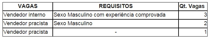 Há novas oportunidades de emprego disponíveis no mercado de trabalho de Vitória da Conquista. O Sistema Nacional de Emprego (Sine) da cidade está intermediando novas vagas para a função de vendedor. Os interessados devem se cadastrar no sistema, dirigindo-se à Secretaria Municipal de Trabalho, Renda e Desenvolvimento Econômico (Semtre), localizada na avenida Bartolomeu de Gusmão, nº 744, bairro Jurema.