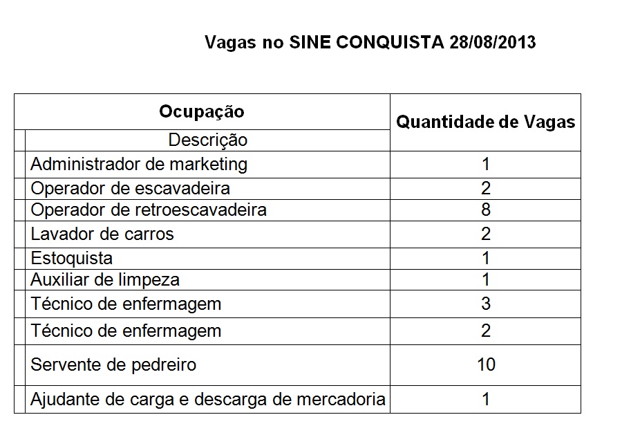 O Sistema Nacional de Emprego (Sine) de Vitória da Conquista acaba de divulgar as oportunidades disponíveis no mercado profissional da cidade para esta quarta-feira, 28. Estão sendo oferecidas 31 vagas para diferentes funções, como servente de pedreiro e operador de retroescavadeira.