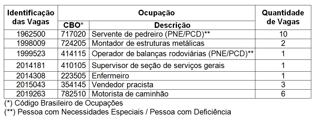 O Sistema Nacional de Emprego (Sine) de Vitória da Conquista acaba de divulgar as oportunidades disponíveis no mercado profissional da cidade para esta terça-feira, 10. Estão sendo oferecidas 24 vagas para diferentes funções, como servente de pedreiro e operador de balanças rodoviárias.