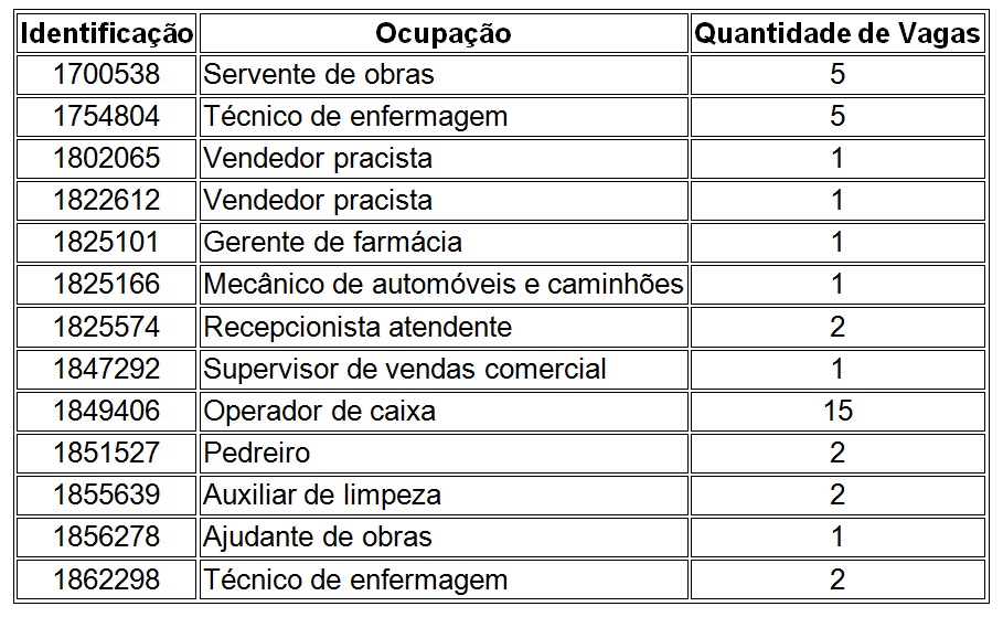 No total, são 39 vagas para diferentes profissões, como mecânico de automóveis e caminhões, operador de caixa, ajudante de obras e vendedor pracista. E se você se interessou por alguma delas, não perca tempo e cadastre-se no Sine Conquista, que está localizado na Avenida Bartolomeu de Gusmão, nº 744, bairro Jurema.