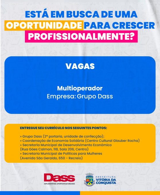 Com o objetivo de ampliar a geração de emprego e renda no município, a Prefeitura de Vitória da Conquista, por meio da Secretaria Municipal de Desenvolvimento Econômico (SMDE), está atuando na intermediação de mão-de-obra, por meio da captação de currículos e encaminhamento de trabalhadores interessados em ocupar uma das 200 vagas oferecidas pela Indústria Dass.